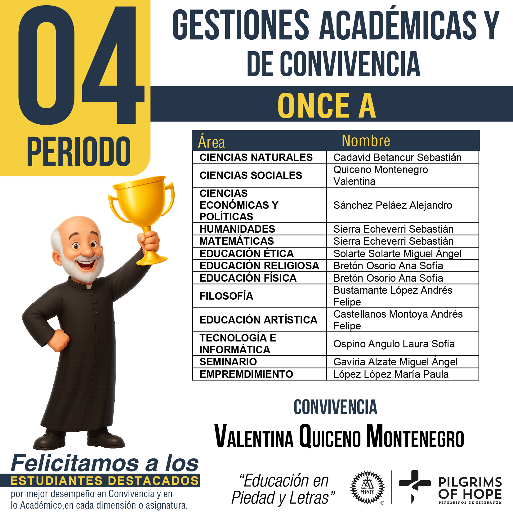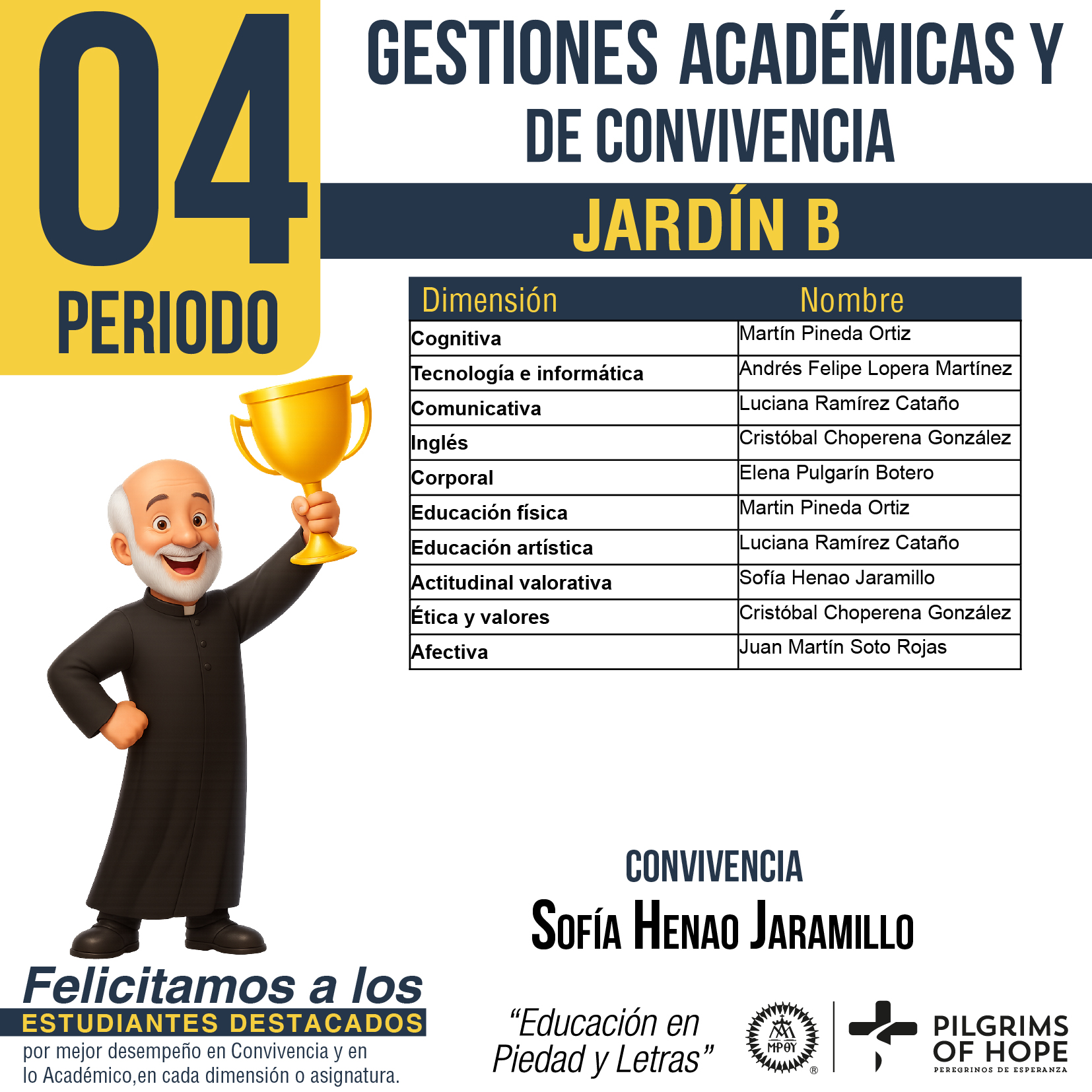 El estudiante que culmina el ciclo de Preescolar logra: Sentirse desde su vivencia cotidiana, creado y amado por Dios Padre; ubicarse en su entorno familiar y social integrando normas y valores. Entender, expresar e iniciar el control de las emociones. Adquirir hábitos escolares y personales que le ayudan en su independencia. Relacionarse con los otros y regular sus actos, desarrollando sentimientos de amistad, jugando cooperativamente, adoptando roles y siendo capaz de sentir compasión o empatía. Explorar el mundo aplicando herramientas cognitivas (investigación y experimentación en proyectos de aula). Expresar su interioridad y desarrollo creativo a través de las actividades artísticas. Adquirir patrones cada vez más complejos de movimiento y control corporal. Comunicarse con un lenguaje acorde a su desarrollo e iniciarse en competencias interpretativa, argumentativa y propositiva. Leer y producir textos en el nivel alfabético. Identificar normas sociales frente a diferentes manifestaciones culturales.